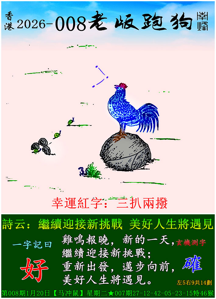 008期老版跑狗一字記之曰:【好】 詩雲:繼續迎接新挑戰,美好人