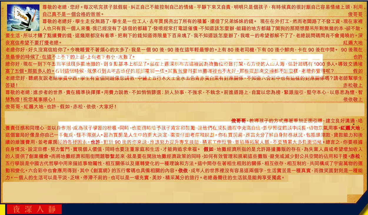 【3】.老總你好,好久沒寫信給你了。今晚睡覺不著煩心的太多了,我是一個90後,90後在這年輕最慘的。上有80後老司機,下有00後小鮮肉,卡在90後在中間。90後現在是最惨的時候了,在這不上不下的上部,上有老下有小,太難了。  也許