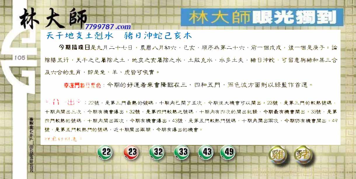 | 主题 :105期:六合皇金句/老总论码/萧公子/林大师/五行夺码/老总信箱截 |