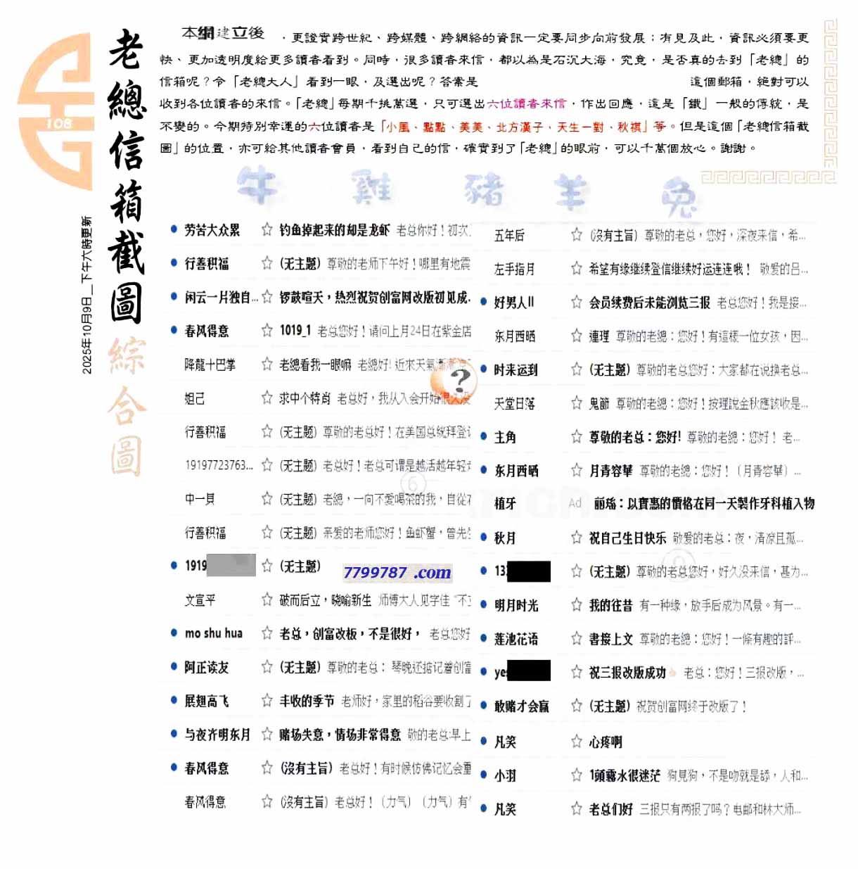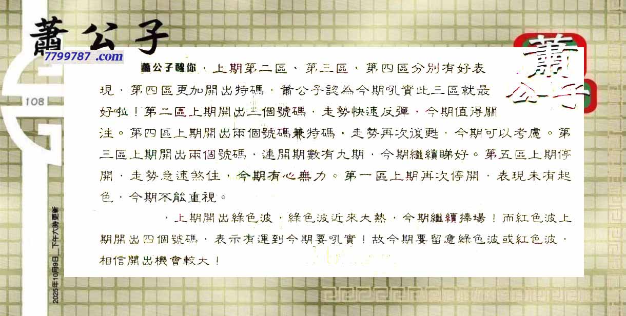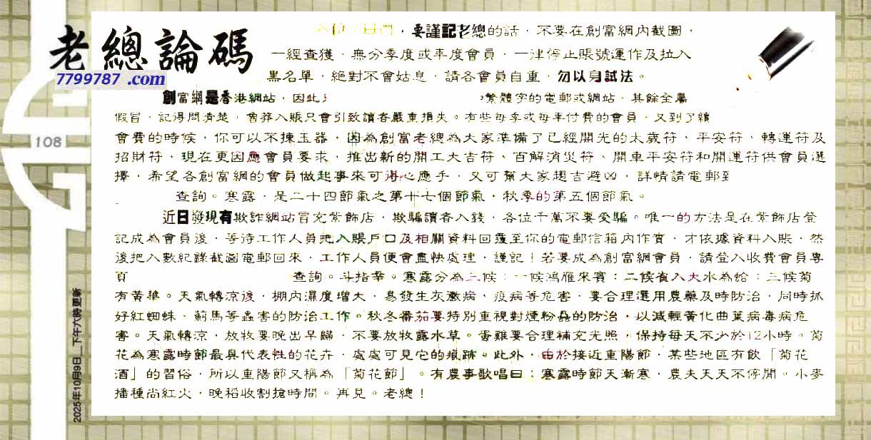 | 主题 :108期:六合皇金句/老总论码/萧公子/林大师/五行夺码/老总信箱截 |