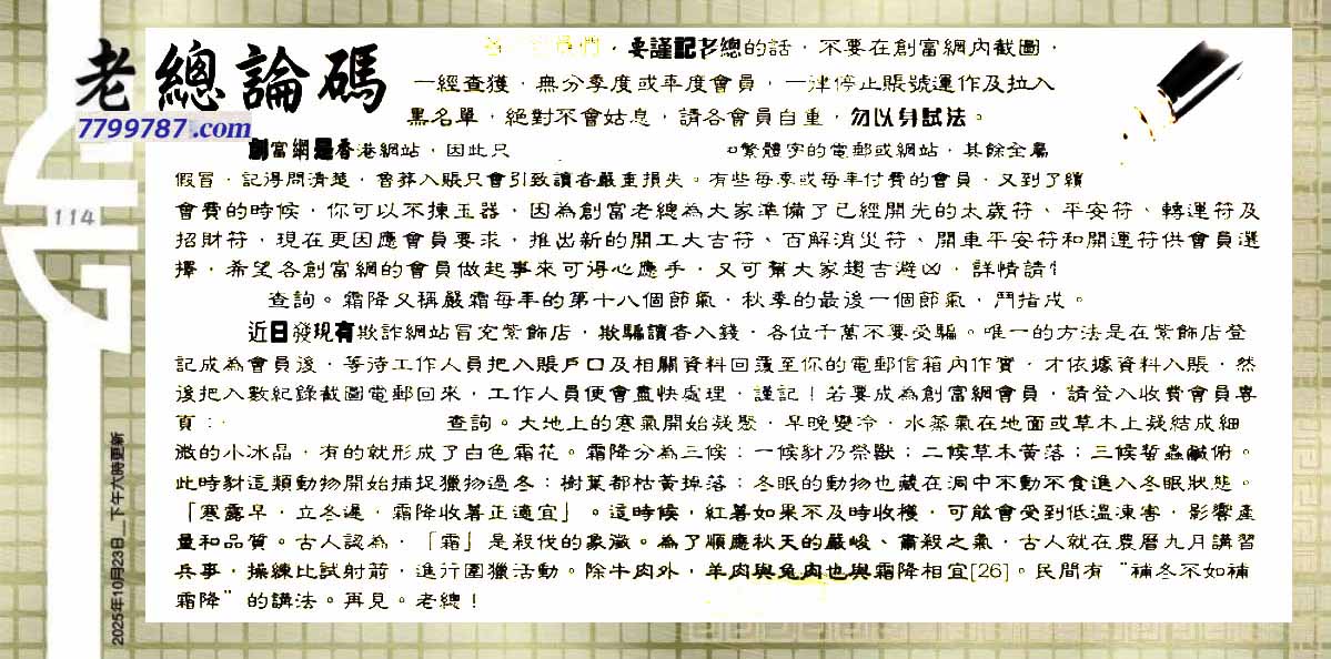 | 主题 :114期:六合皇金句/老总论码/萧公子/林大师/五行夺码/老总信箱截 |
