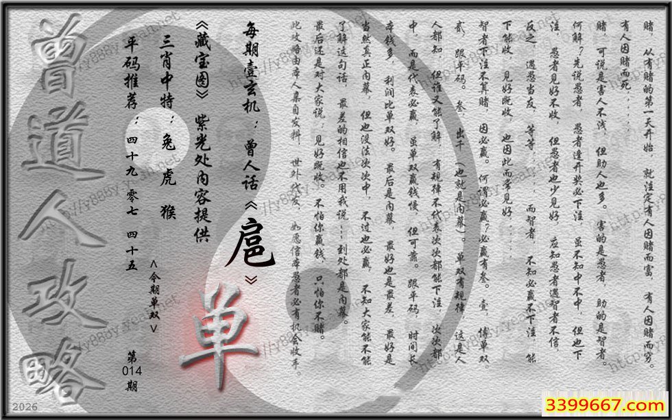 | 主题 :014期藏寶圖 新:但觉山光侵酒绿 老:溪涧岂能留得住 禁:牛 禁:3尾 |