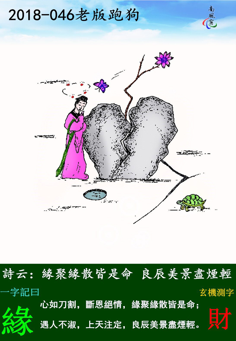 046期:老版跑狗一字記之曰:【緣】玄機測字《財》