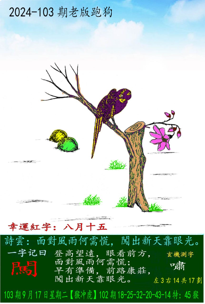 主题 : 103期老版跑狗一字記之曰:【闖】 玄機測字:《嘯》
