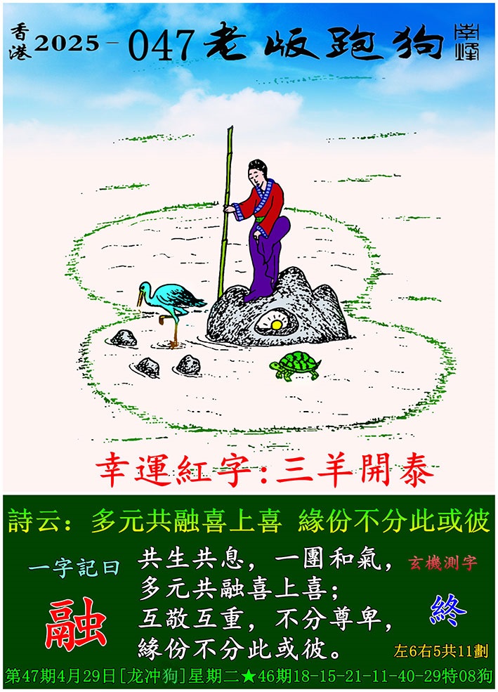 047期老版跑狗一字記之曰:【融】 玄機測字:《終》