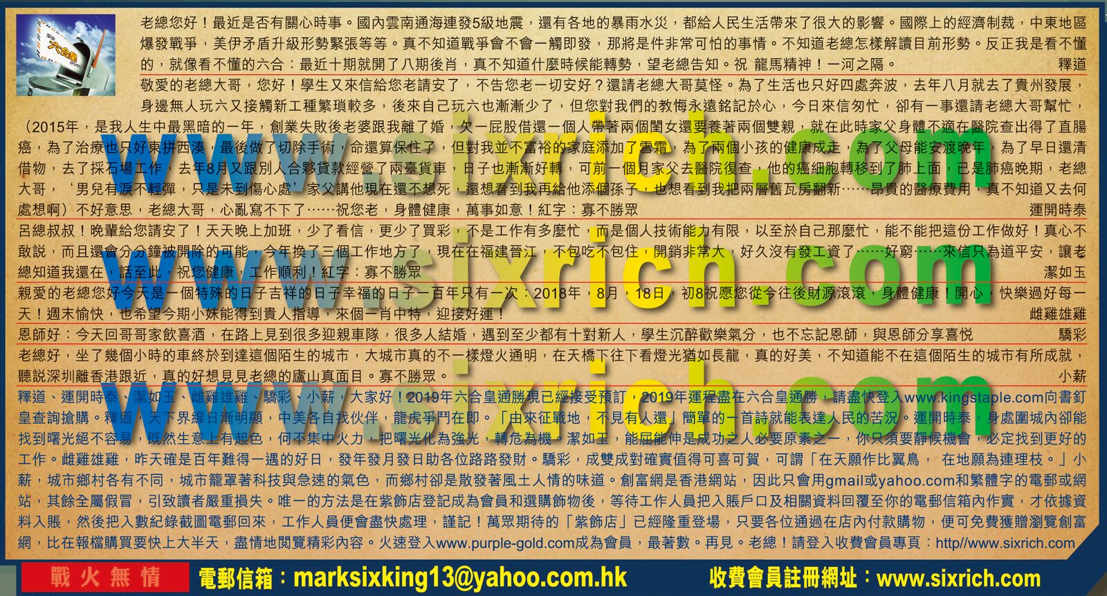 【2】敬愛的老總大哥,您好!學生又來信給您老請安了,不告您老一切安好?還請老總大哥莫怪。為了生活也只好四處奔波,去年八月就去了貴州發展,身邊無人玩六又接觸新工種繁瑣較多,後來自己玩六也漸漸少了,但您對我們的教悔永遠銘記於心,今日來信匆忙,卻有一事還請老總大哥幫忙,(2015年,是我人生中最黑暗的一年,創業失敗後老婆跟我離了婚,欠一屁股借還一個人帶著兩個閨女還要養著兩個雙親,就在此時家父身體不適在醫院查出得了直腸癌,為了治療也只好東拼西凑,最後做了切除手術,命還算保住了,但對我並不富裕的家庭添加了雪霜,為了网個小孩的健康成走,為了父母能安渡晚年,為了早 日還清借物,去了探石場工作,去年8月又跟別人合夥貸款經營了兩臺貨車,日子也漸漸好轉,可前一個月家父去醫院復查,他的癌細胞轉移到了肺上面,已是肺癌晚期,老總大哥,‘男兒有淚不輕彈,只是未到傷心處’家父講他現在還不想死,還想看到我再給他添個孫子,也想看到我把兩層舊瓦房翻新……昂貴的醫療費用,真不知道又去何處想啊)不好意思,老總大哥,心亂寫不下……祝您老,身體健康,萬事如意!紅字:寡不勝眾 ---運開時泰