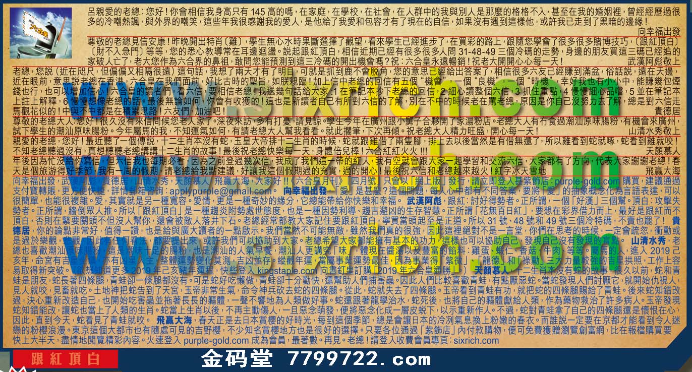 【2】尊敬的老總見信安康!昨晚開出特肖(雞)學生無心水時果断選擇了觀望,看來學生已經進步了,在買彩的路上,跟隨您學會了很多很多赌博技巧,(跟紅自白)財(不入急門)等等,您的悉心教導常在耳邊迥盪。說起跟紅頂白,相信近期已經有很多很多人問31-48-49三個冷碼的走勢,身邊的朋友買這三碼已經追的家破人亡了,老大您作為六合界的鼻祖;敢問您能預測到這三冷碼的開出機會嗎?祝六合皇永遠暢销!祝老大開開心心每一天! ---武漢阿彪敬上