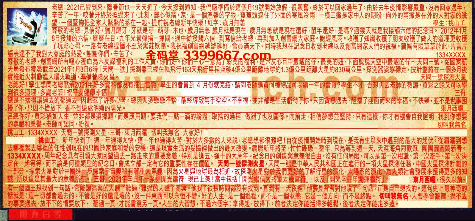 【2】.尊敬的老總,見信好,臘月尾牙,牙就是芽,萌芽,木也,歲月無恙歲月就是現在,歲月無恙就是現在還好,鼠年還好,是嗎?過幾天就是我接觸六信的紀念日。2012年1月8日接觸的六信,歷歷在目,九年光景彈指一揮間。過中從接觸六信,到寫信給老總,再到加入創富網大家庭。飽經風雨。收獲了知識收種了朋友收獲了做人的道理更收獲了玩彩心得。一路有老總提攜不至於黑莊欺壓。我祝福創富網越辦越好,會員滿天下。同時我想在記念日收到老總以及創富網家人們的祝福。篇幅有限草草於此,片言片語表達不了我對大家庭的熱愛。謝謝你們,辛苦了。  1334XXXX