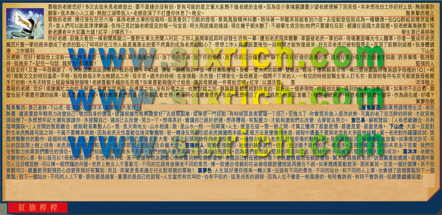 【2】.尊敬的老總:憶往昔在茫茫六海,覓得老總主筆的信箱時,就是看到了引航的燈塔,意氣風發精神抖擻。期待著一早醒來就能看到六信。去信能登信就成為一種驕傲。在QQ群組就像眾星捧月。家人們可以說是津津樂道,各持已見討論老總提及的每一句金言,時光飛逝緣起緣滅,現在幾乎都失聯了,不過學生肯定他/她們只要還在玩彩,都還在這個大家庭裡。祝老總萬事勝意!祝新老讀者中大彩贏大錢!紅字:夕陽西下。  學生意已易移敬