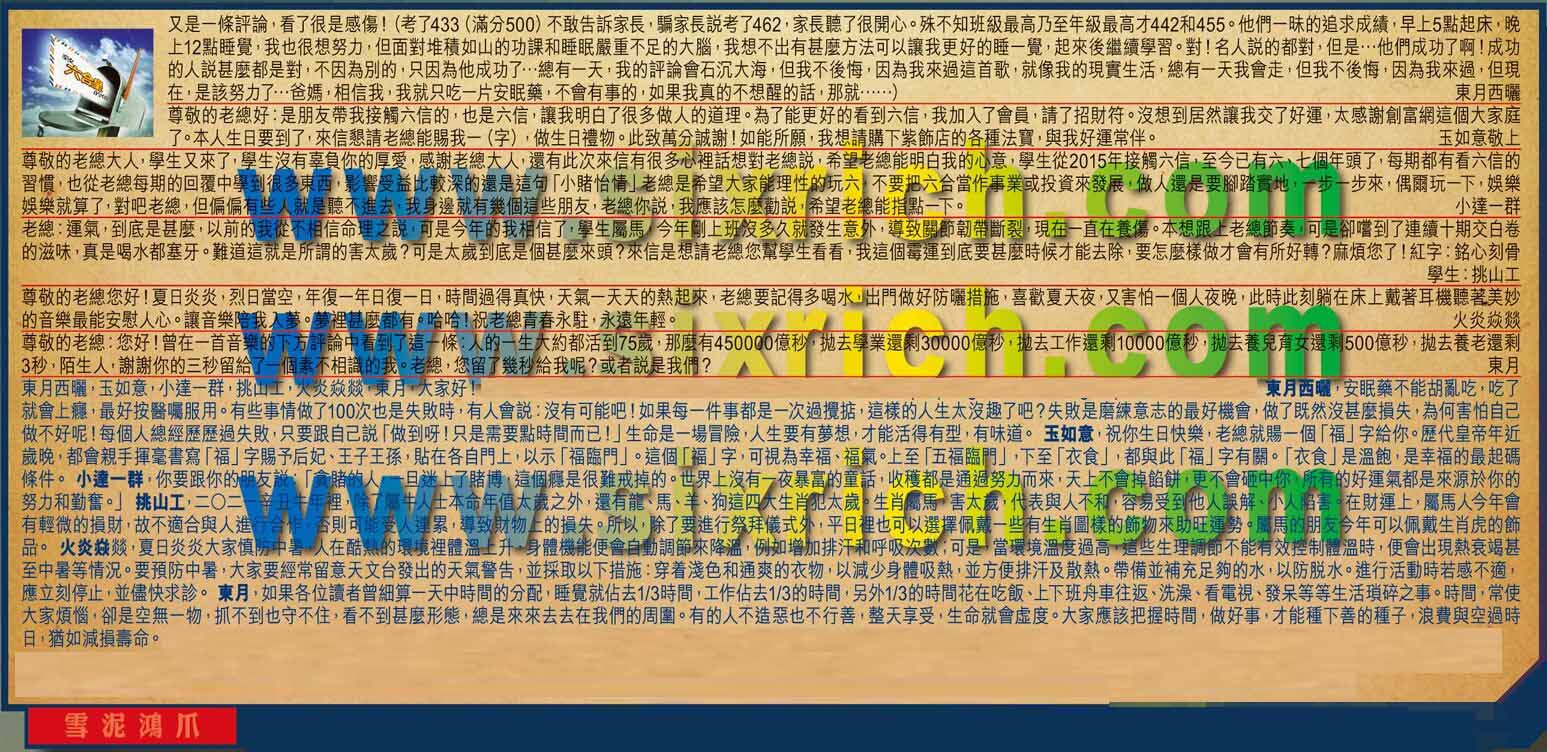 【3】.尊敬的老總大人,學生又來了,學生沒有負你的厚愛,感謝老總大人,還有此次來信有很多心裡話想對老總說,希望老總能明白我的心意,學生從2015年接觸六信,至今已有六、七個年頭了,每期都有看六信的習慣,也從老總每期的回覆中學到很多東西,影響受益比較深的還是這句「小賭怡情」老總是希望大家能理性的玩六,不要把六台當作事業或投資來發展,做人還是要腳踏實地,一步一步來,偶雨玩下,娛樂娱樂就算了,對吧老總,但偏偏有些人就是聼不進去,我身邊就有幾個這些朋友,老總你說,我應該怎麼勸說,希望老總能指點一下。  小達一群