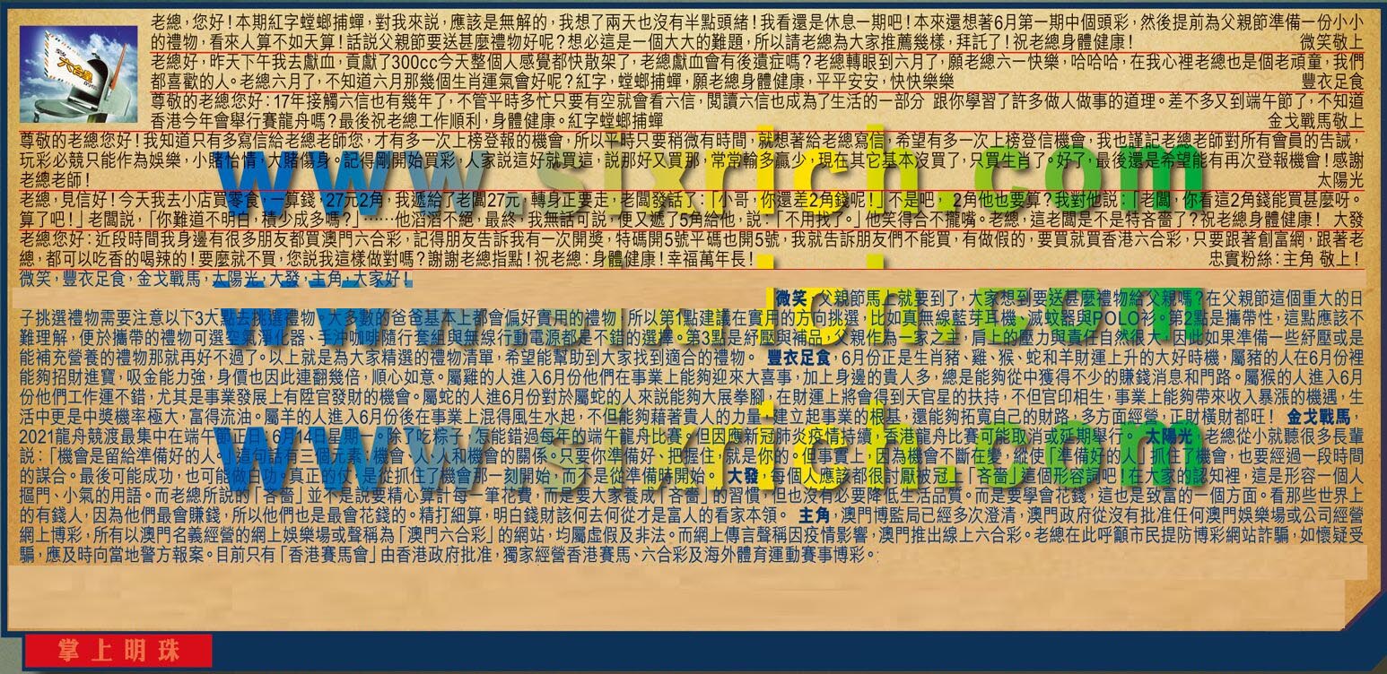 【4】.尊敬的老總您好!我知道只有多寫信給老總老師您,才有多一次上榜登報的機會,所以平時只要稍微有時間,就想著給老總寫信,希望有多一次上榜登信機會,我也謹記老總老師對所有會員的告誡,玩彩必競只能作為娛樂,小賭怡情,大賭傷身。記得剛開始買彩,人家說這好就買這,說那好又買那,常常輸多贏少,現在其它基本沒買了,只買生肖了。好了,最後還是希望能有再次登報機會!感謝老總老師!  太陽光