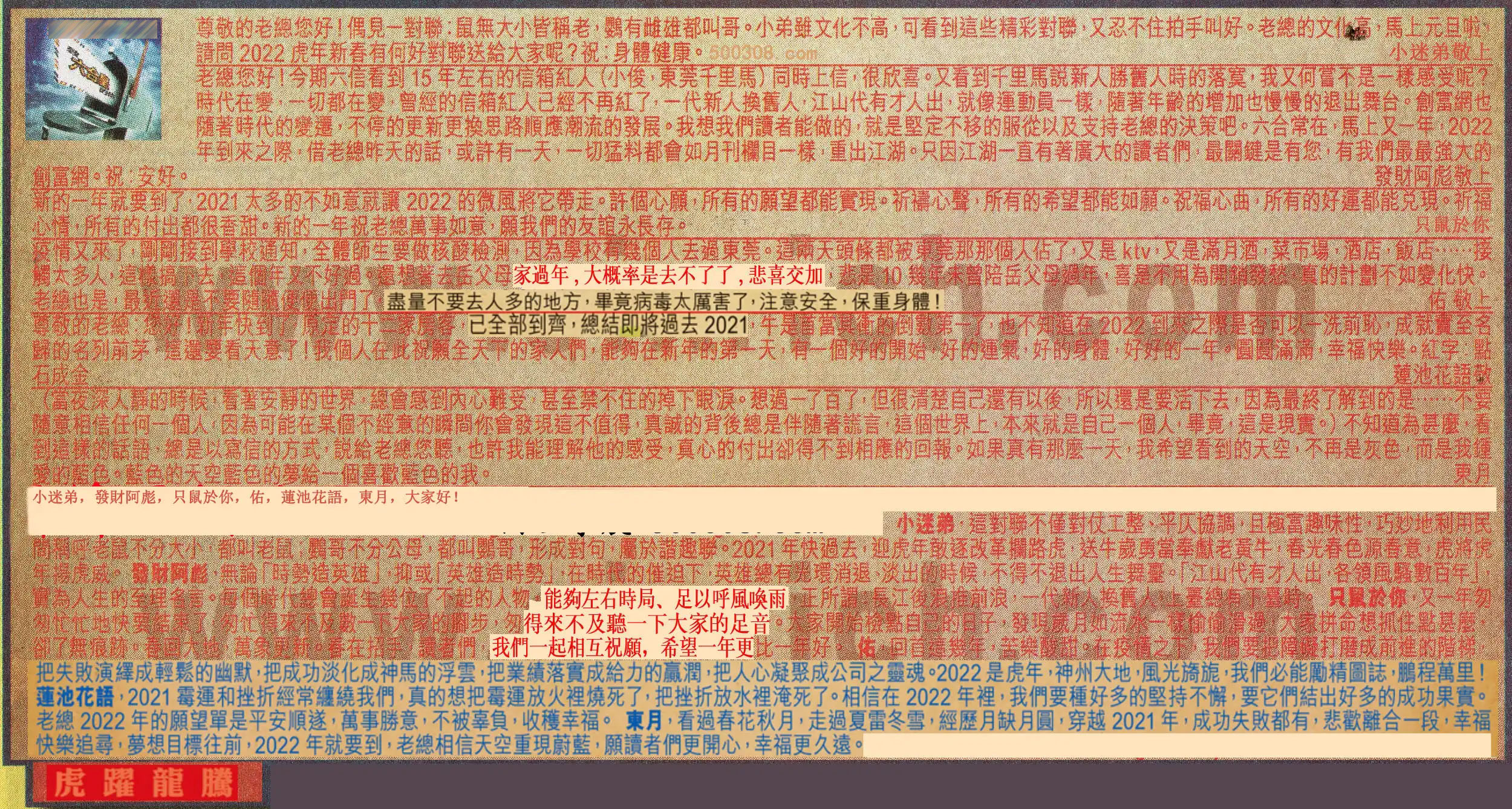 【2】. 老總您好!今期六信看到15年左右的信箱紅人(小俊,東莞千里馬)同時上信,很欣喜。又看到千里馬說新人勝舊人時的落寞,我又何嘗不是一樣感受呢?時代在變,一切都在變,曾經的信箱紅人已經不再红了,一代新人换舊人,江山代有才人出,就像運動員一樣,隨著年龄的增加也慢慢的退出舞台。創富網也随著時代的變遷,不停的更新更换思路顺應潮流的發展。我想我們讀者能做的,就是堅定不移的服從以及支持老總的決策吧。六合常在,馬上又一年,2022年到來之際,借老總昨天的話,或許有一天,一切猛料都會如月刊欄目一樣,重出江湖。只因江湖一直有著廣大的讀者們,最關鍵是有您,有我們最最強大的創富網。祝:安好。  發財阿彪敬上