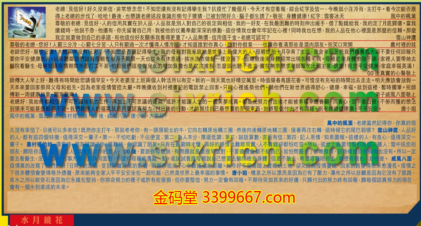 【1】.老總:見信好!好久沒來信,非常想念您!不知您還有沒有記得學生我?抗疫忙了幾個月,今天才有空看報,綜合紅字及信一,今晚就小注冷肖,主打牛。看今次能否跟得上老總的步伐了,哈哈!最後,也懇請老總送段意識形態句子猜猜,已被封閉好久,腦子都生誘了。敬祝:身體健康!紅字:雪窖冰天  風中的楓葉