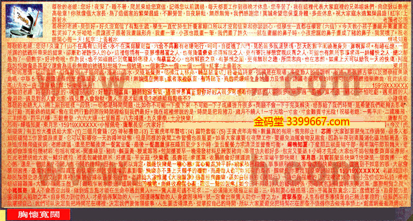 【3】.尊敬的老總:您好!久逢了!山不在高有仙則名,水不在深有龍則靈,六合不再難有老總則行,呵呵。自從進了六門,見的最多就是號碼,整天的數字圍繞著身旁,算啊算啊。有時在想,一個所謂的號碼所帶來的結果、卻牵動著許多人的心,這裡包括有一夜夢想暴富之人,也有負債累累求得解脱之人,更有寄託夢想實現成真之人,可能也有無所事事求得一絲暢快之人,總之都是為了一個數字。好神奇哦。作為我,也不知道自己到底屬於哪種人,有暴富之心,也有解脱之意,有夢想之圖,更有無聊之趣,所謂志向,也在志想。如果上天可以給我一天的快樂,那么我的快樂會是甚麼?還會為這些無聊的號碼犯愁嗎?一個號碼,一個數字,一個,一個,一個。紅字:上善若水  東月思
