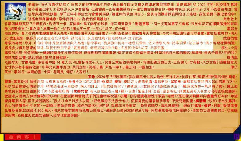 【1】.老總好,好久沒寫信給您了,回想之前經常登學生的信,再給學生暗示玄機之餘還教導我指點我,甚是感激!從 2021 年初,因疫情生意經營不善後出來打工就很少玩六少看信箱,但是會員一直有續費就為了一個忠實信箱的信仰,轉眼間快到 2024 年了,3 年不見甚是想念!寫信想與老師敘敘舊,聊下在年末哪些生肖會蓄勢而發,讓重回的我拾回信心,發現有個讀者跟我同名也上過榜,我在想要不要改個名字!祝福老師身體健康,常伴我們左右,為我們保駕護航! 茶米敬上
