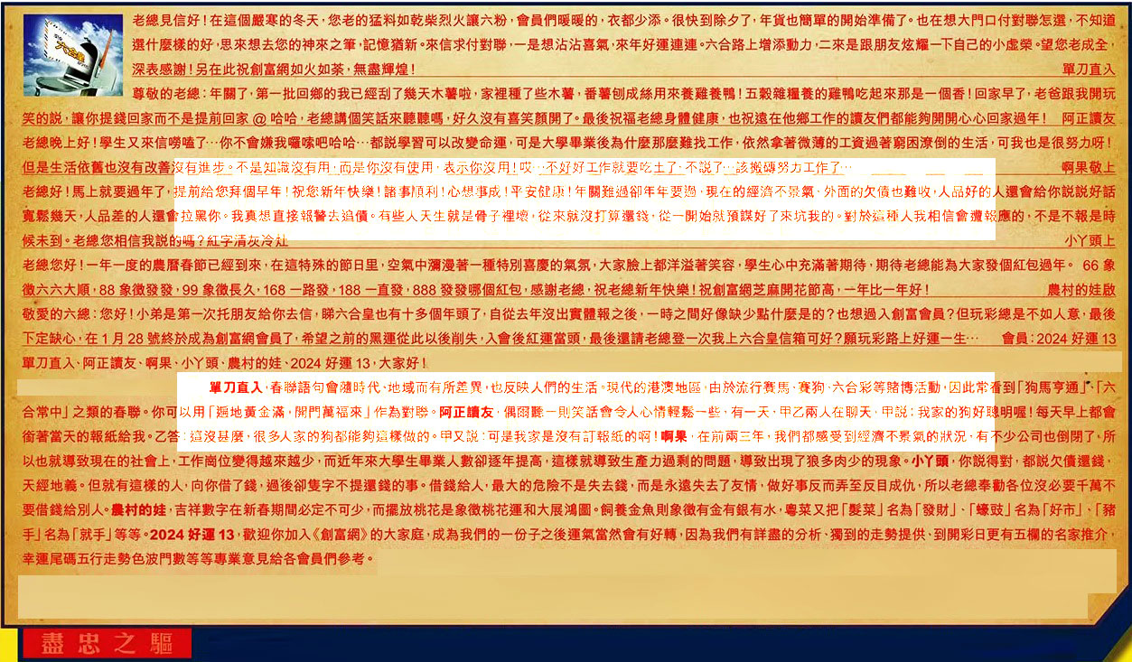 【6】.敬愛的六總:您好!小弟是第一次托朋友給你去信,睇六合皇也有十多個年頭了,自從去年沒出實體報之後,一時之間好像缺少點什麼是的?也想過入創富會員?但玩彩總是不如人意,最後下定缺心,在 1 月 28 號終於成為創富網會員了,希望之前的黑運從此以後削失,入會後紅運當頭,最後還請老總登一次我上六合皇信箱可好?願玩彩路上好運一生... 會員:2024 好運 13