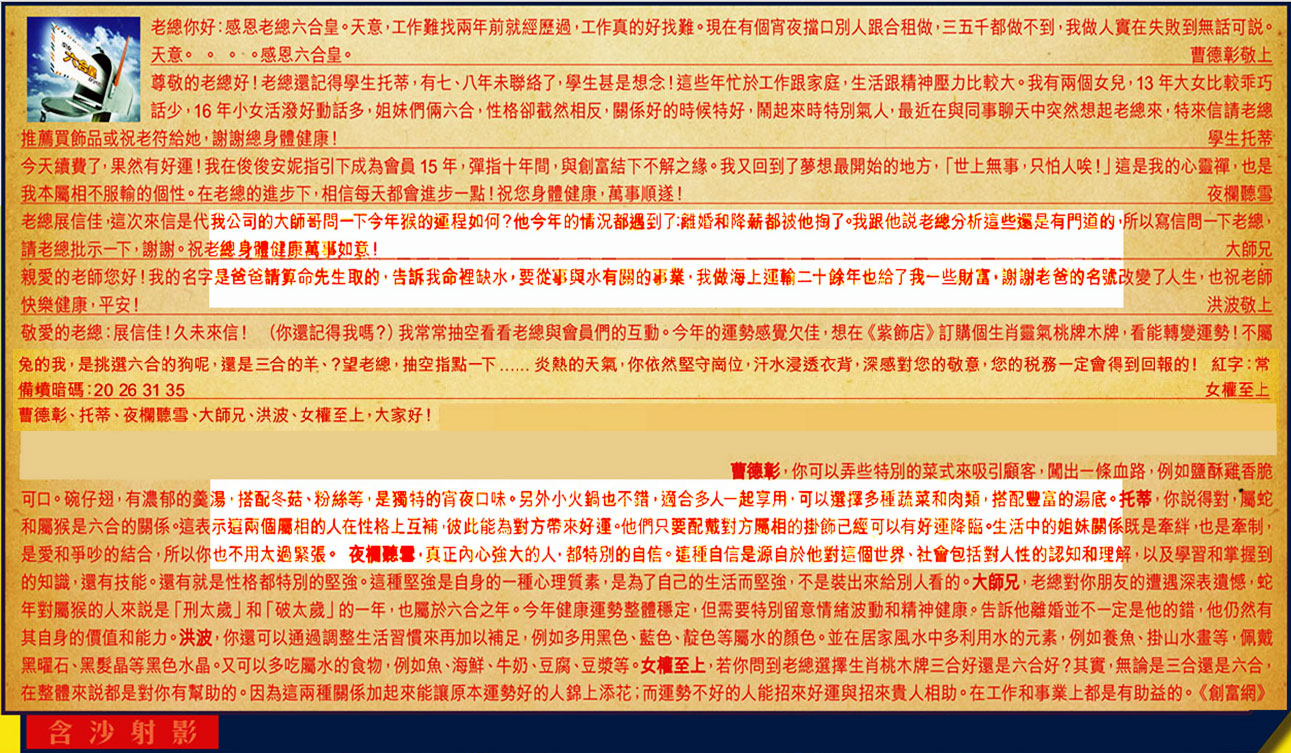 【6】.敬愛的老總:展信佳!久未來信!(你還記得我嗎?)我常常抽空看看老總與會員們的互動。今年的運勢感覺欠佳,想在《紫飾店》訂購個生肖靈氣桃牌木牌,看能轉變運勢!不屬兔的我,是挑選六合的狗呢,還是三合的羊、?望老總,抽空指點一下......炎熱的天氣,你依然堅守崗位,汗水浸透衣背,深感對您的敬意,您的税務一定會得到回報的!紅字:常備墳暗碼:20 26 31 35 女權至上